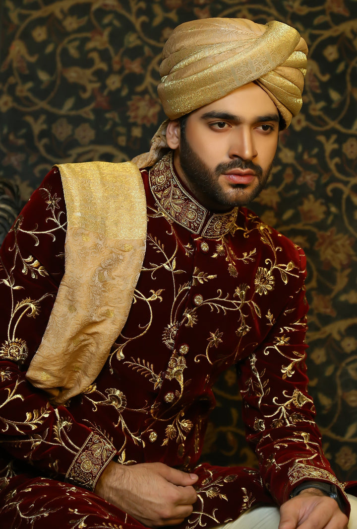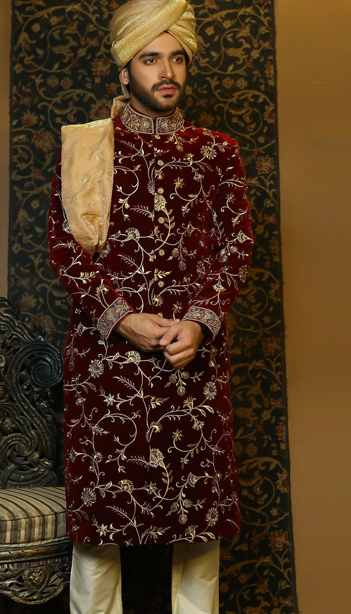 Charming Maroon Velvet Traditional Handwork and Embroidered Sherwani Set.