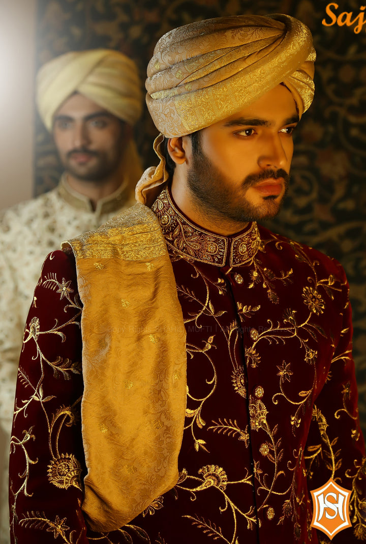 Full embroidered sherwani with kora dabka hand embroidery on Collar , Buttons , Cuff . Paired with a matching kurta pajama , Shoes and Contrast Golden Turban. Shoes will be made same sherwani Fabric which will make you look great.
