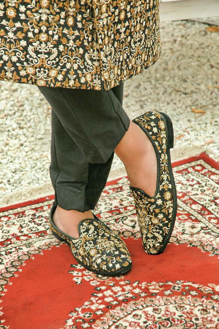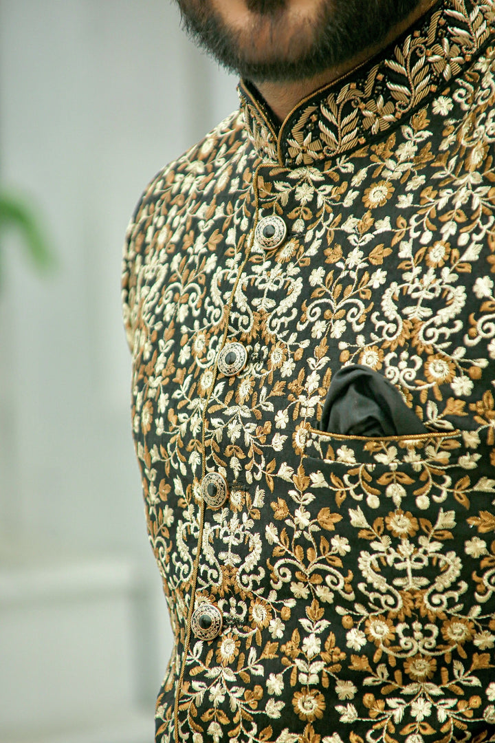 Classic Black Traditional Handwork and Embroidered Sherwani Set
