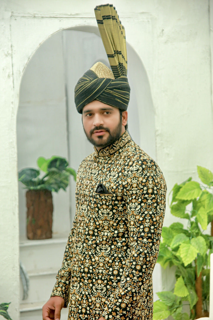 Full embroidered Messorisherwani with koradabka hand embroidery onCollar . Front and Metallic Button on Front and Cuff, . Paired with a matching Black kurtapajama , Shoes and Organza Turban.which will make you look great.