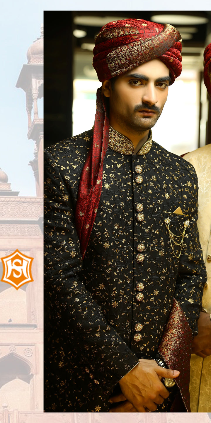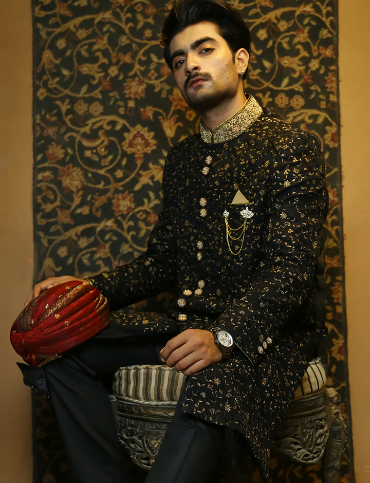 Classic Black Traditional Handwork and Embroidered Sherwani Set