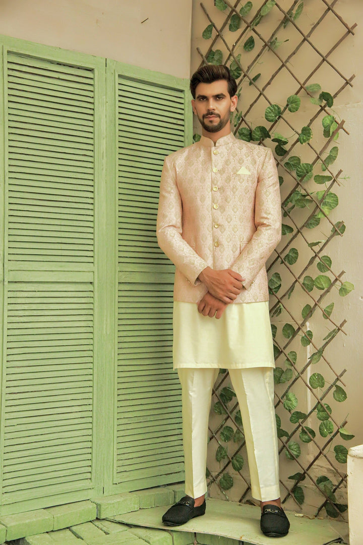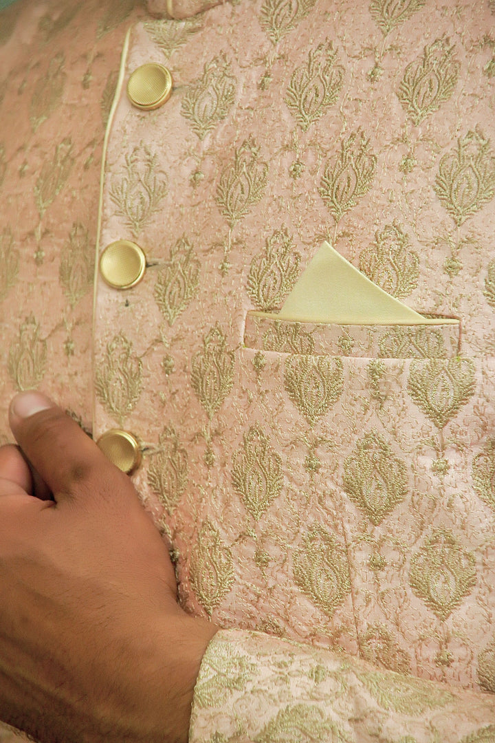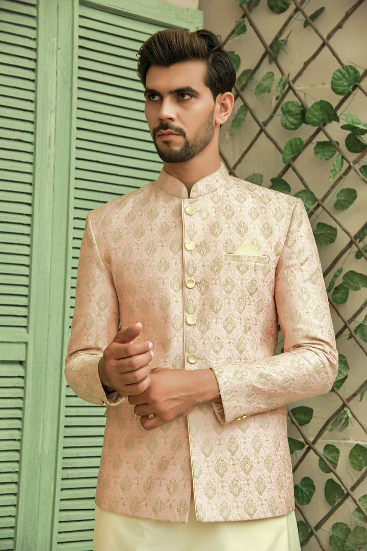 Prince Coat : This Light pink Prince coat is crafted from lush art silk fabric with opulent Royal Texture in gold embroidered all over. The exquisite piece features a Metallic buttoned front and a bandhgala collar adorned with luxurious embellishments. Wear it over a soft pink, with Light Fawn Kurta Pajama set.