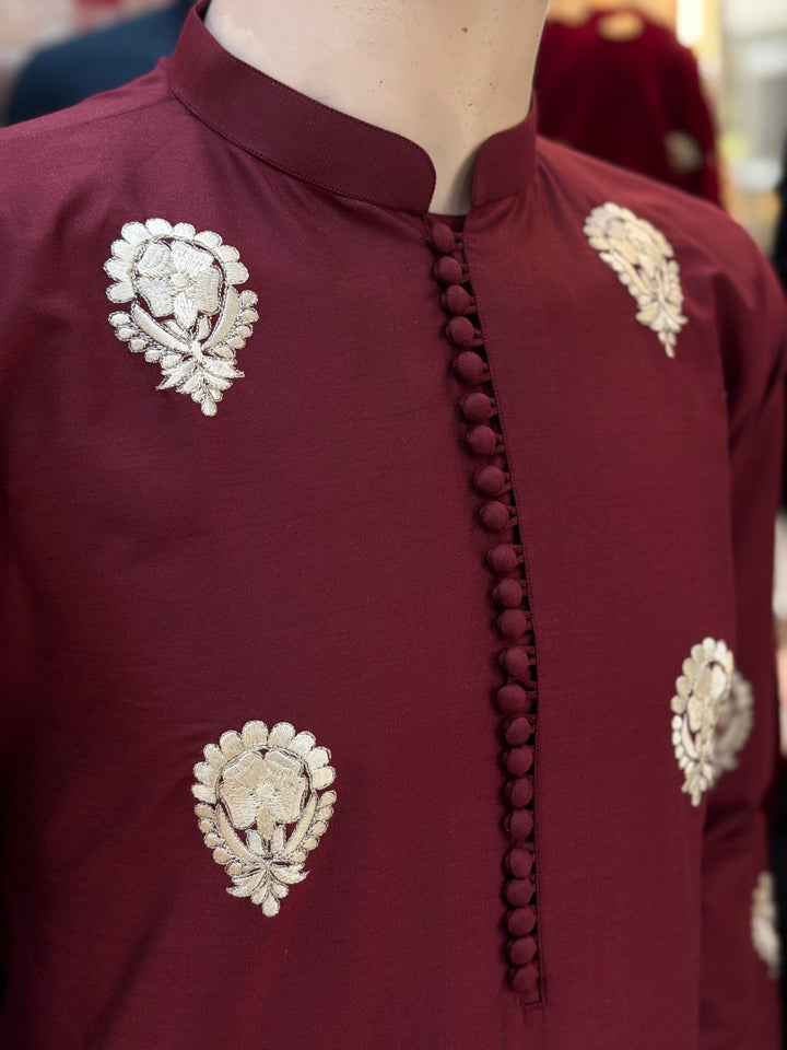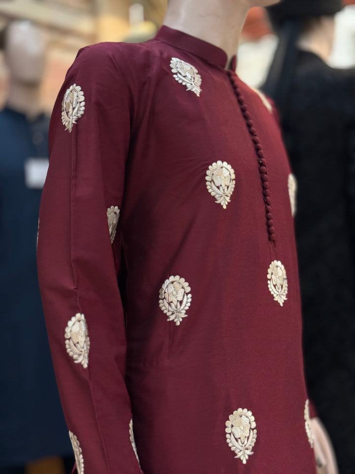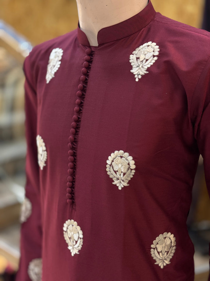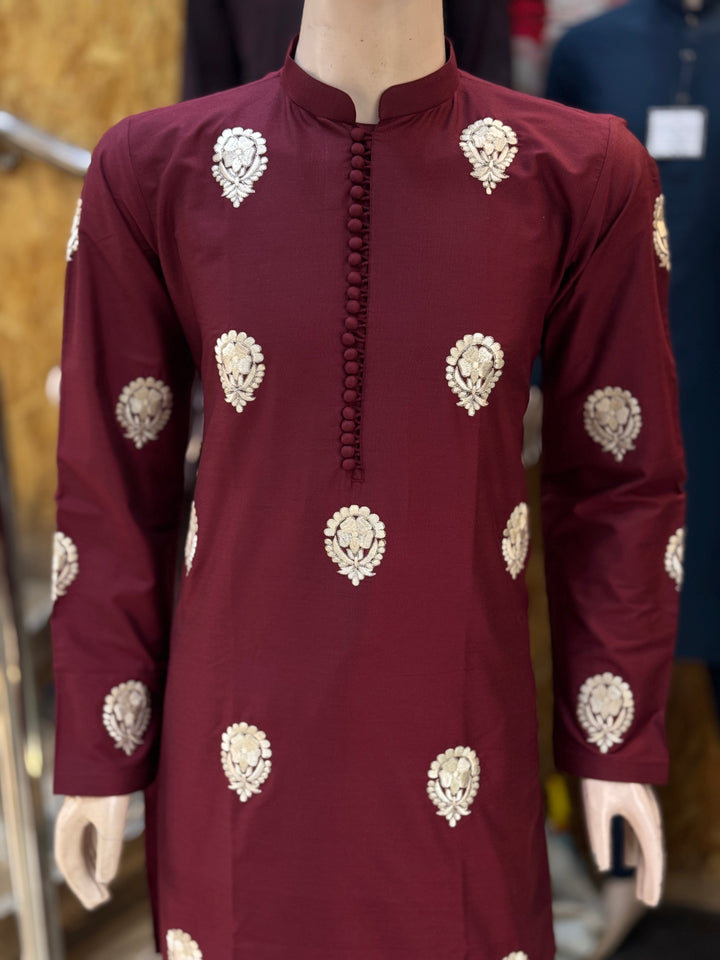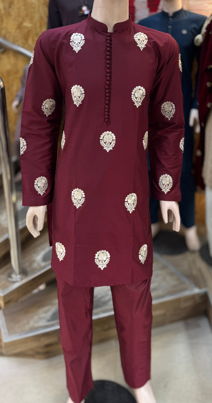Kurta Pajama : Cotton silk Fabric Kurta with Loop Buttons Style , High Quality Stitched with Double Lock , Maroon same Pent Style Pajama , Elastic Waistband and 2 Pockets