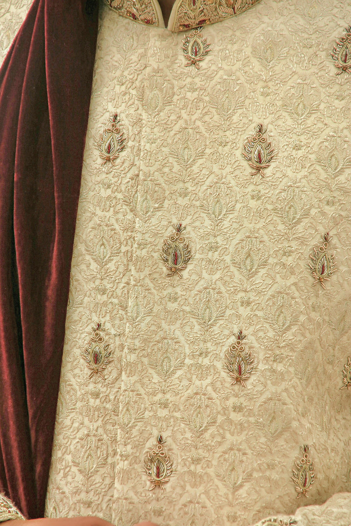 Ravishing Light Fawn Traditional Motifs Handwork and Embroidered Sherwani Set