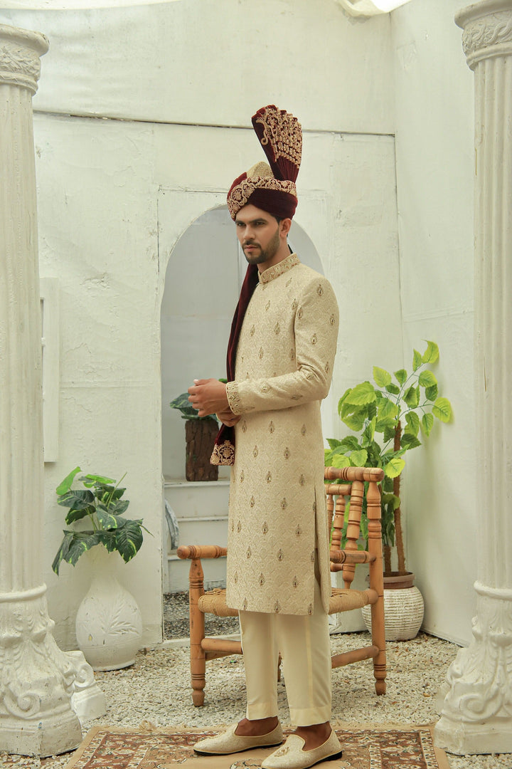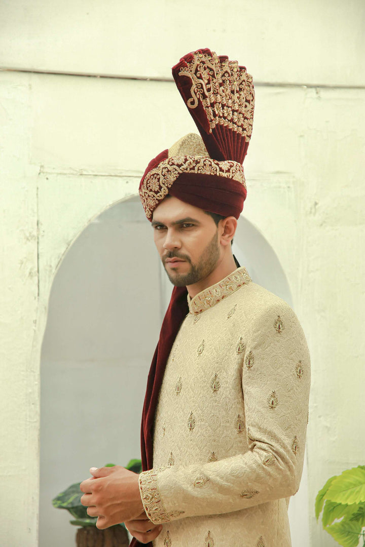 Full embroidered sherwani with Full koradabka Motifs hand embroidery on front , Collar , Sleeves and Shoes. Paired with a matching kurtapajama , Shoes and Maroon Velvet Zari Embroidered Turban. which will make you look great.