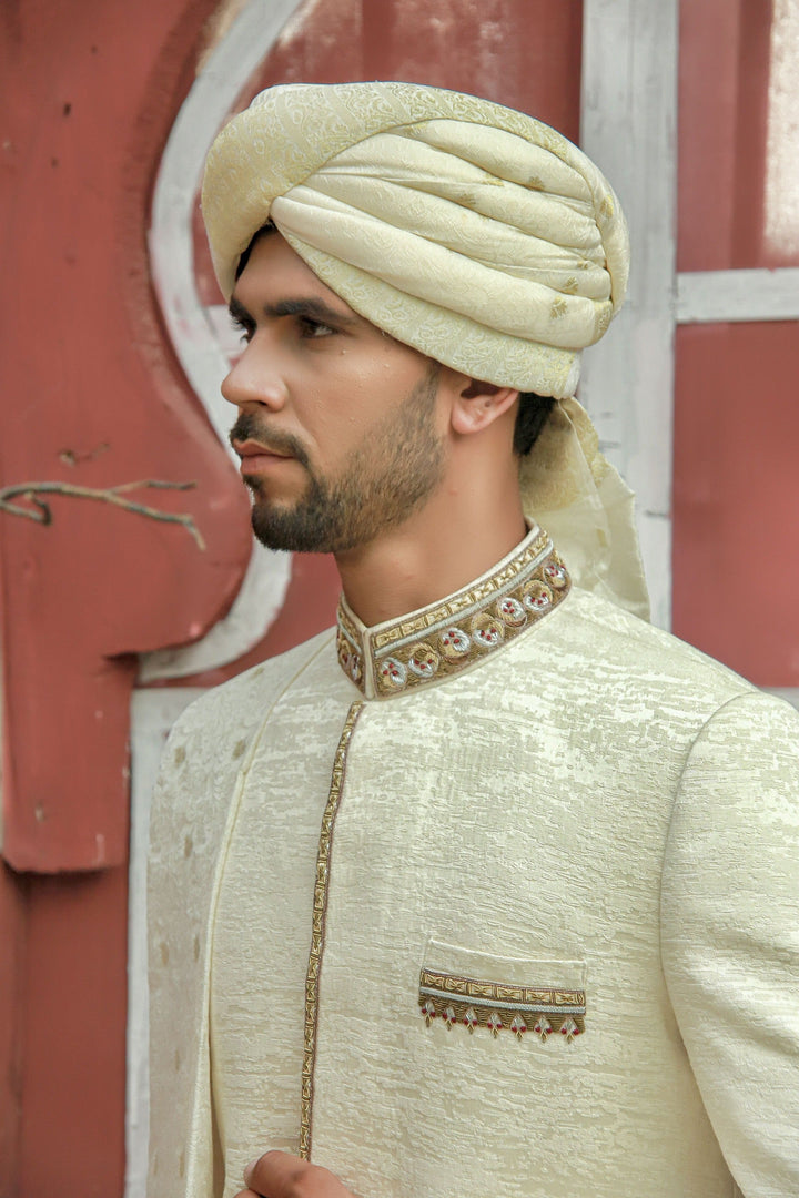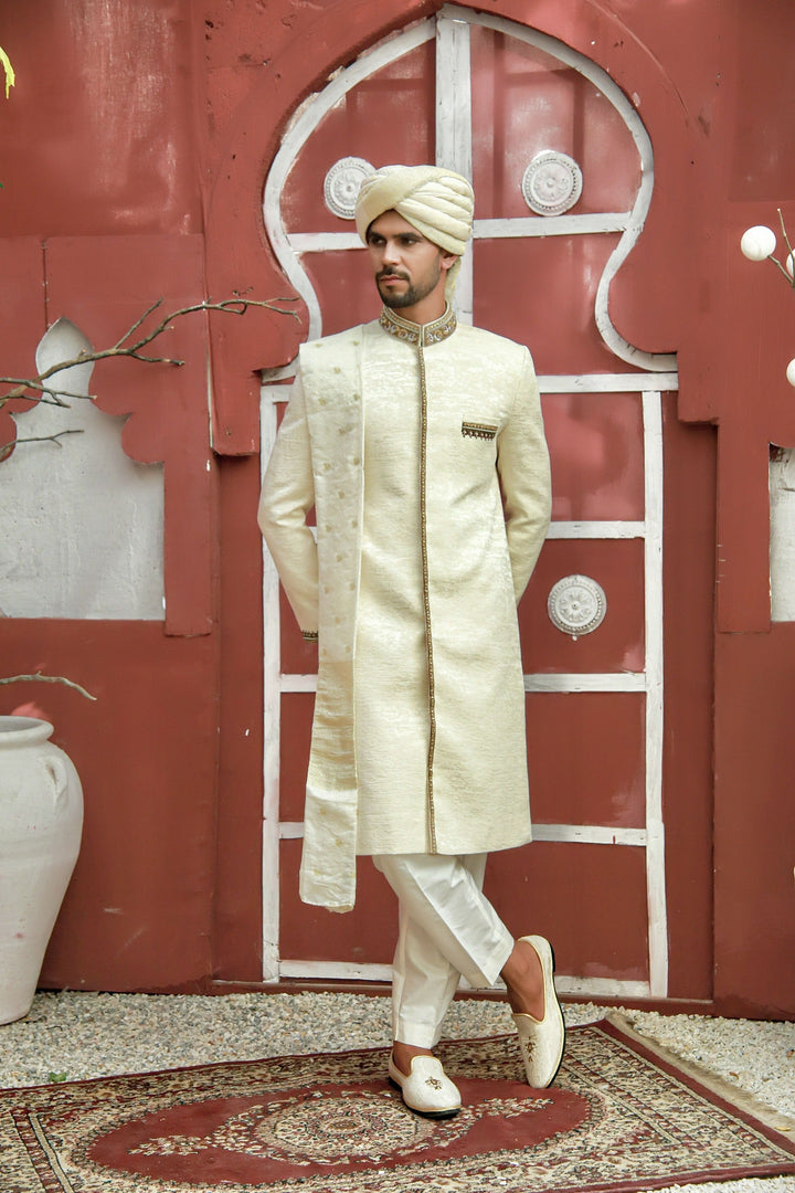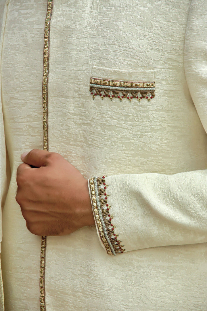 Rich and Classy Cream Patterned Traditional Jacquard Textured Sherwani Set.