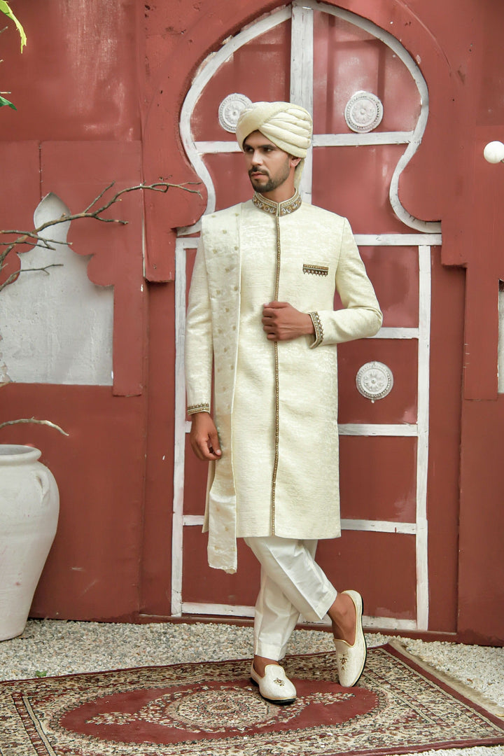 Textured sherwani with Zero size koradabka hand embroidery on front , Collar ,Cuff , Pocket and Shoes Paired with a matching kurta pajama , Shoes and Jamawar Turban .which will make you look great and Elegant.